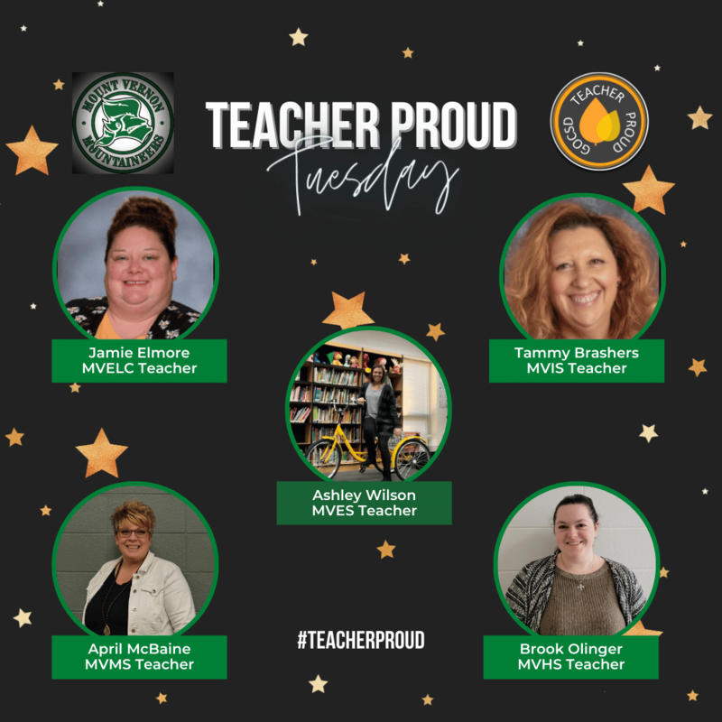 It’s time to celebrate! Join us as we recognize five of Mount Vernon’s stellar educators in a special teacher feature celebrating Teacher Proud Tuesday! Thank you, Ms. Elmore, Mrs. Wilson, Mrs. Brashers, Mrs. McBaine, and Mrs. Olinger for your hard work and dedication. Our students’ lives are richer because of your investment!