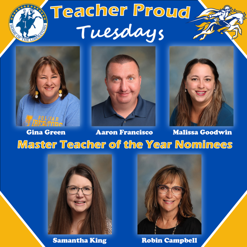 These five educators were selected by their peers as the Teacher of the Year for their building. One of them will be honored as Master Teacher of the Year for Bolivar Schools later this month!