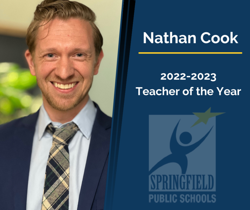 Springfield Public Schools named Mr. Nathan Cook 2022-2023 Teacher of the Year April 18 during the Foundation for Springfield Public Schools Celebrate SPS event. Four finalists were also celebrated: Tiffany Coughenour, Jeffries Elementary School; Tiffany Lynch, Pipkin Middle School; Jami Schulte, Study Alternative School; and Mary Tilton, Cowden Elementary School.